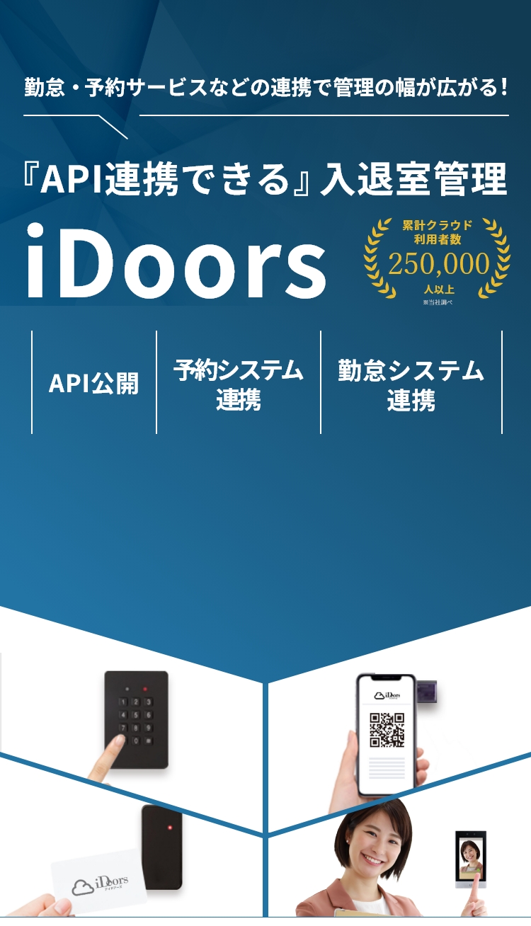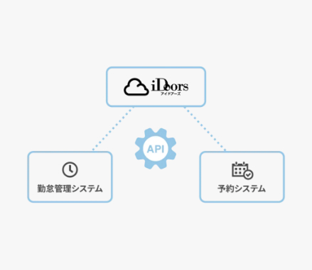 iDoorsはAPIが利用可能。お客様の管理業務の効率化・見える化に役立ちます。ご利用中の他社サービス(勤怠、予約システム等)と連携させるのはもちろんのこと、要件に合わせてお客様独自のAPIを開発することも可能です。